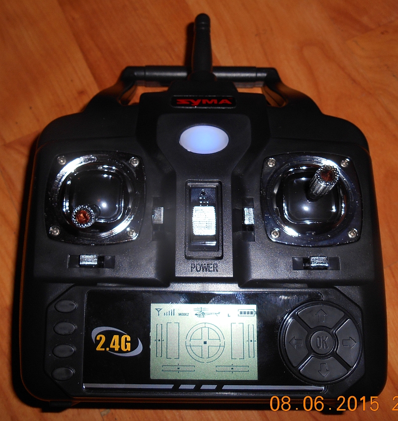 3: The large blue light on the remote will now come on and start blinking. Push the left-hand stick on the remote control forward and then let it go back. This "arms" the helicopter. If you did this correctly, that blue light will go from blinking to steady-on and same with the white LED on the heli.