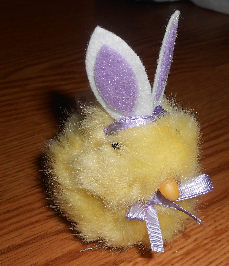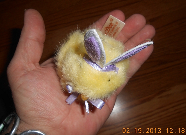 The Chirping Palm Pet is a rather lifelike-looking baby chick with rabbit ears & a bow for Easter that chirps whenever you place it in the palm of your hand.