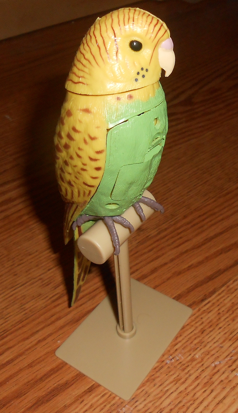 It emits rather realistic chirping sounds as a real parakeet might, it turns its head to the left and also moves its tail "feathers" at the same time.