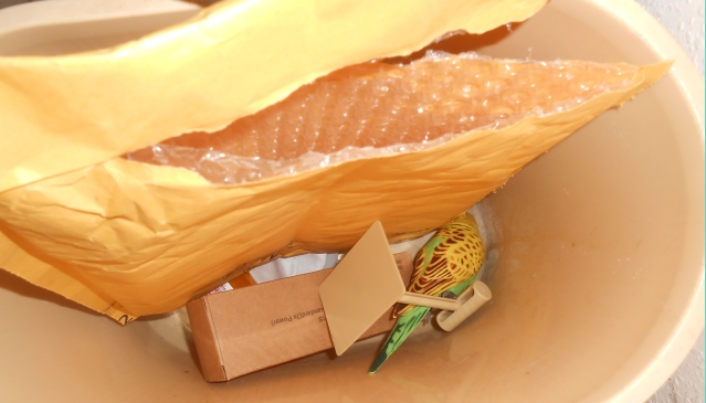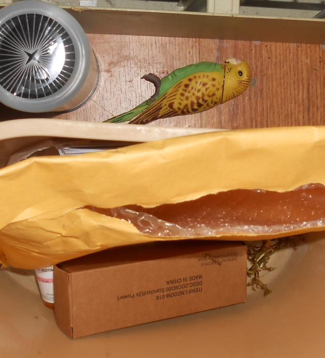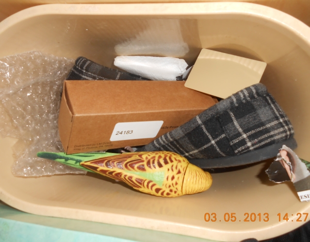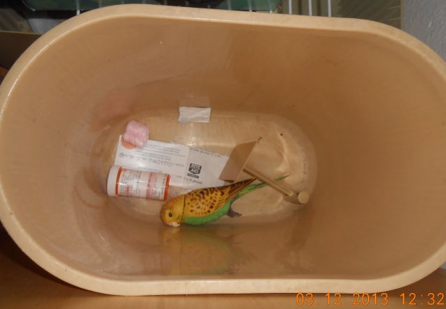 My cat Nikki nocked the stupid sodding phoney-bologna fake plastic bird into the waste bin (wastepaperbasket) in my room a couple of mornings ago.