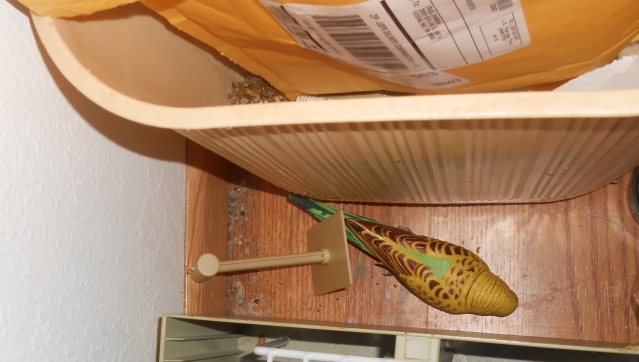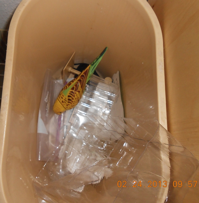 She threw both the Perfect Polly™ and its perch in the garbage; I saw them in the can shortly before dumping the can into a bin bag (plastic garbage bag) so that the dustman (garbage man) will pick it up for disposal.