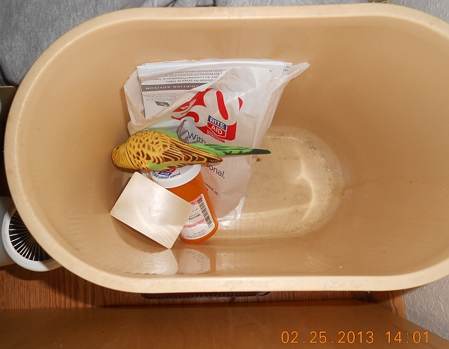 My cat Nikki nocked the stupid sodding phoney-bologna fake plastic bird into the waste bin (wastepaperbasket) in my room (AGAIN!!!) two mornings ago; I saw her do it this time. She nocked the bird and its perch into the garbage can at 10:15am PST on 02-25-13.