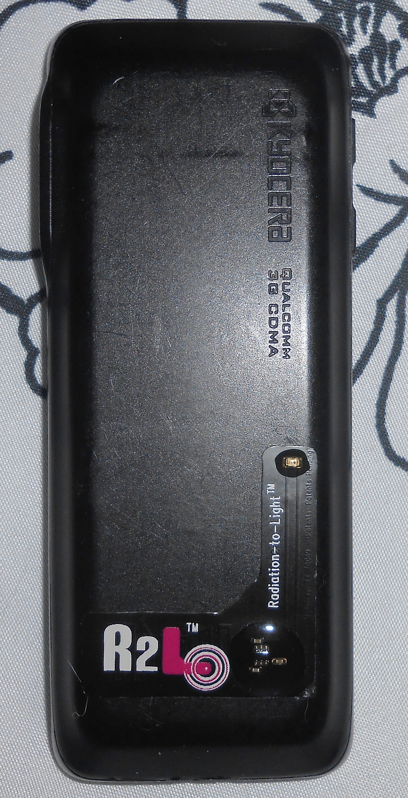 Very brief video on YourTube showing the R2L Radiation Buster working on my Kyocera Jax cellular telephone handset. I dialed my VMB twice; the R2L lights up briefly whenever the handset is transmitting.