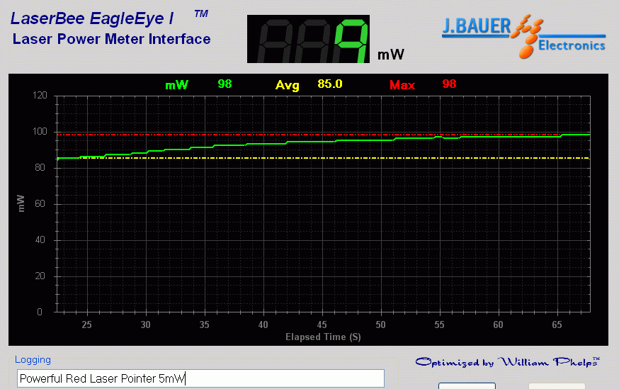 Measures 98mW on a LaserBee 2.5W USB Laser Power Meter w/Thermopile.