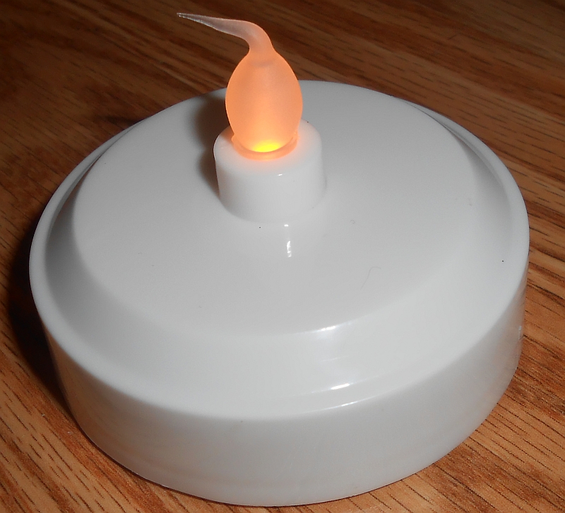 Photograph of the LED Tea Light (Halloween), illuminated.