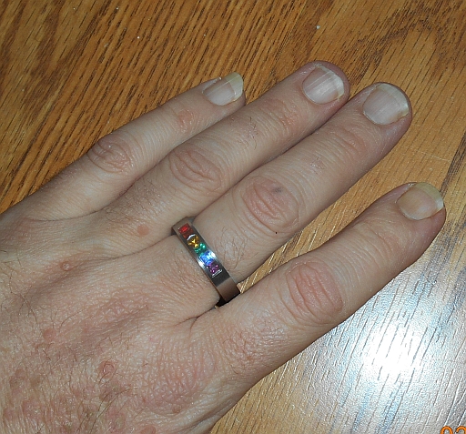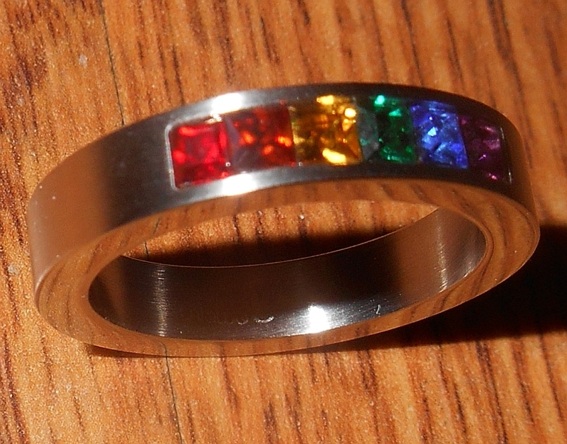 This is a rather spiffy ring made from thick stainless steel that has six semiprecious stones in it arranged like a rainbow: red, orange, yellow, green, blue, and purple.