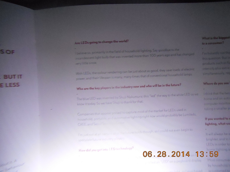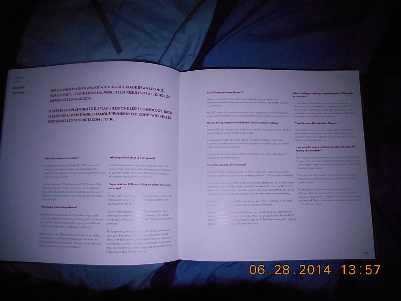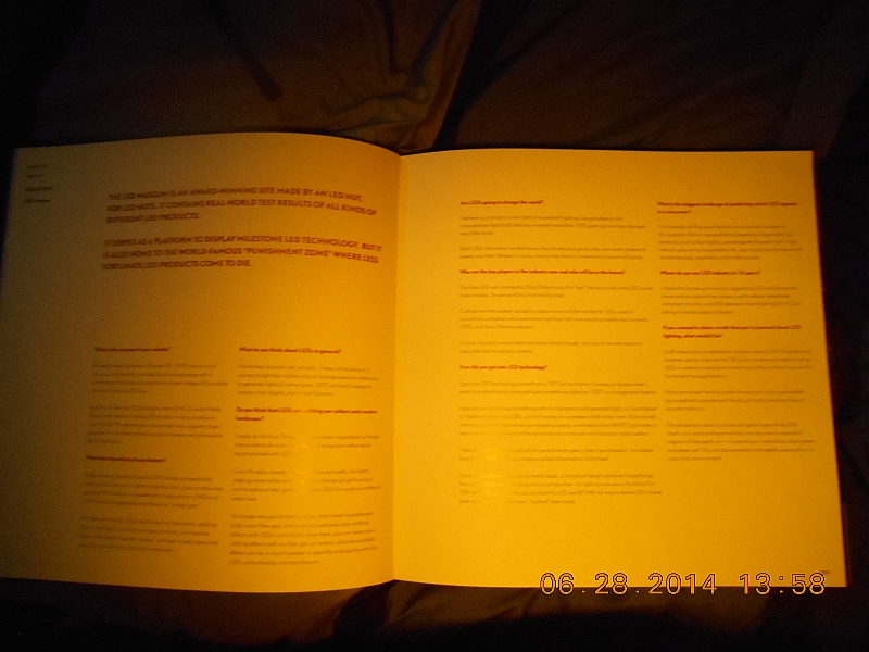 Picture of the Beam N ReadŽ 6-LED Handsfree Deluxe Reading Light illuminating the pages of the book, "Planet LED (A Coffee Table Book)" with no filter in place.