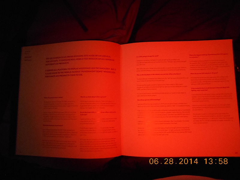 Picture of the Beam N ReadŽ 6-LED Handsfree Deluxe Reading Light illuminating the pages of the book, "Planet LED (A Coffee Table Book)" with the red filter in place.