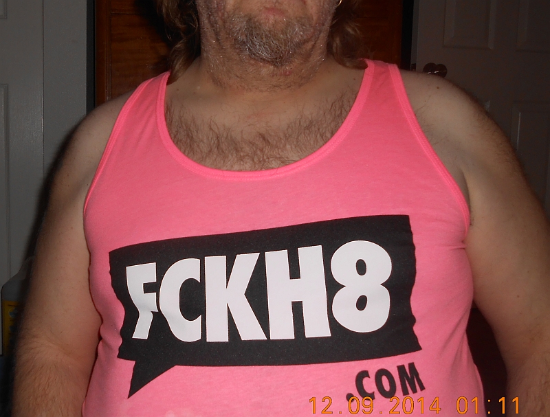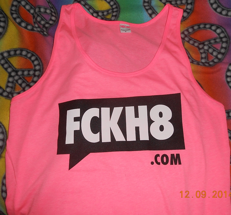 This is a FCKH8.COM sleevess tee. It comes in what I'd describe is a very slightly pastel hot pink; sometimes known as, "F46607 pink" -- but officially called, "neon pink".