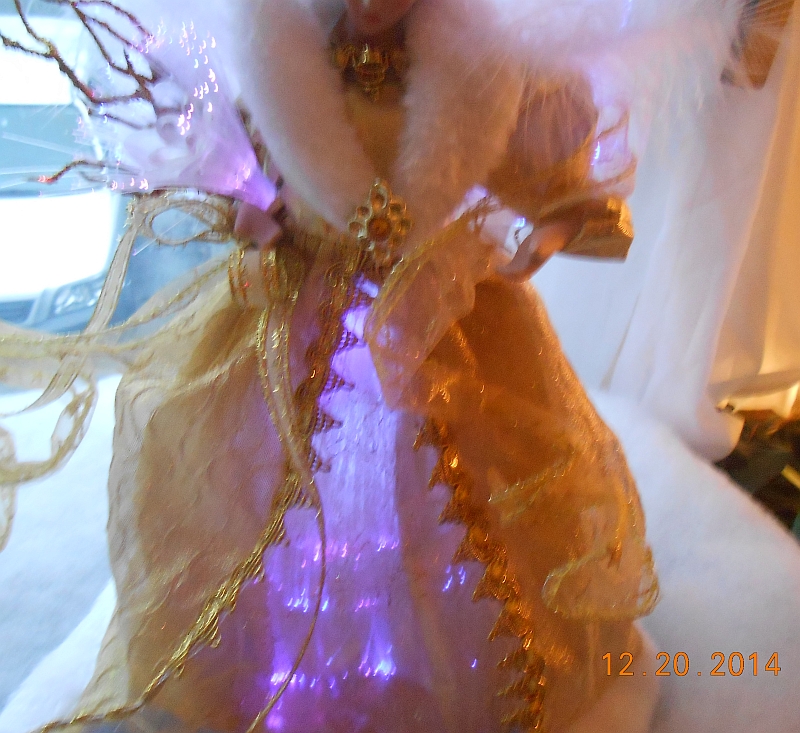 She features red, green, and blue LEDs inside that perform a color wash effect, and optical fibers to carry the light to the areas above her wings and throughout her gold lamé gown.