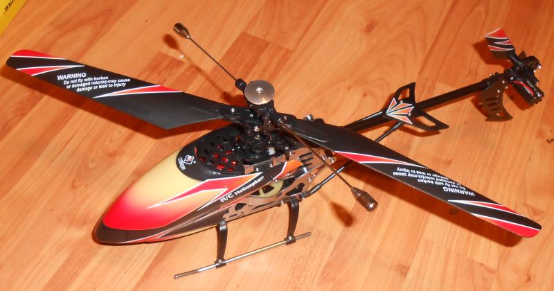 This is a fairly large, lightweight (as a helicopter in a metal & plastic body goes), easy-to-fly 4-channel remote-controlled outdoor (and indoors with a large enough space) helicoper. Its remote uses RF (radio frequency) radiation.