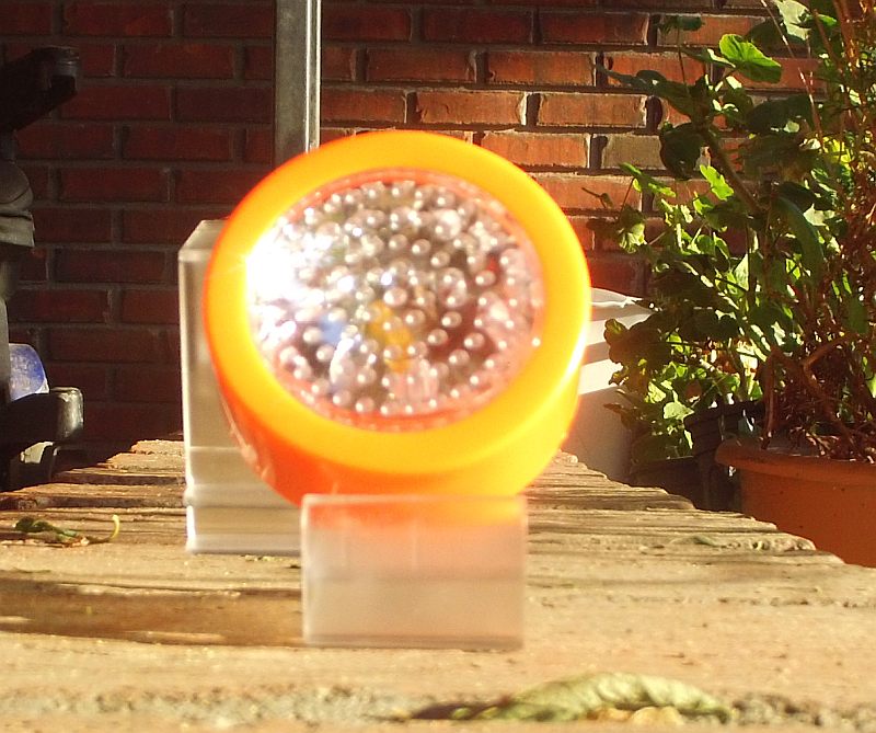 This is a flickering (strobing, actually) light designed for you to put inside a Halloween Jack'O Lantern (carved pumpkin); it is meant to replace candles and thus, make the Jack'O Lantern safe and windproof. It is a flat, circular (puck-shaped) device that has two diffused yellow LEDs (1 stays steady-on, the other one rapidly strobes).
