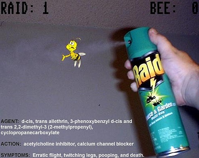 What might happen if you hose down the Honey Nut Cheerios™ Bee with Raid™ House and Garden® insecticide (or "bugicide" if you prefer) in an aerosol bomb.