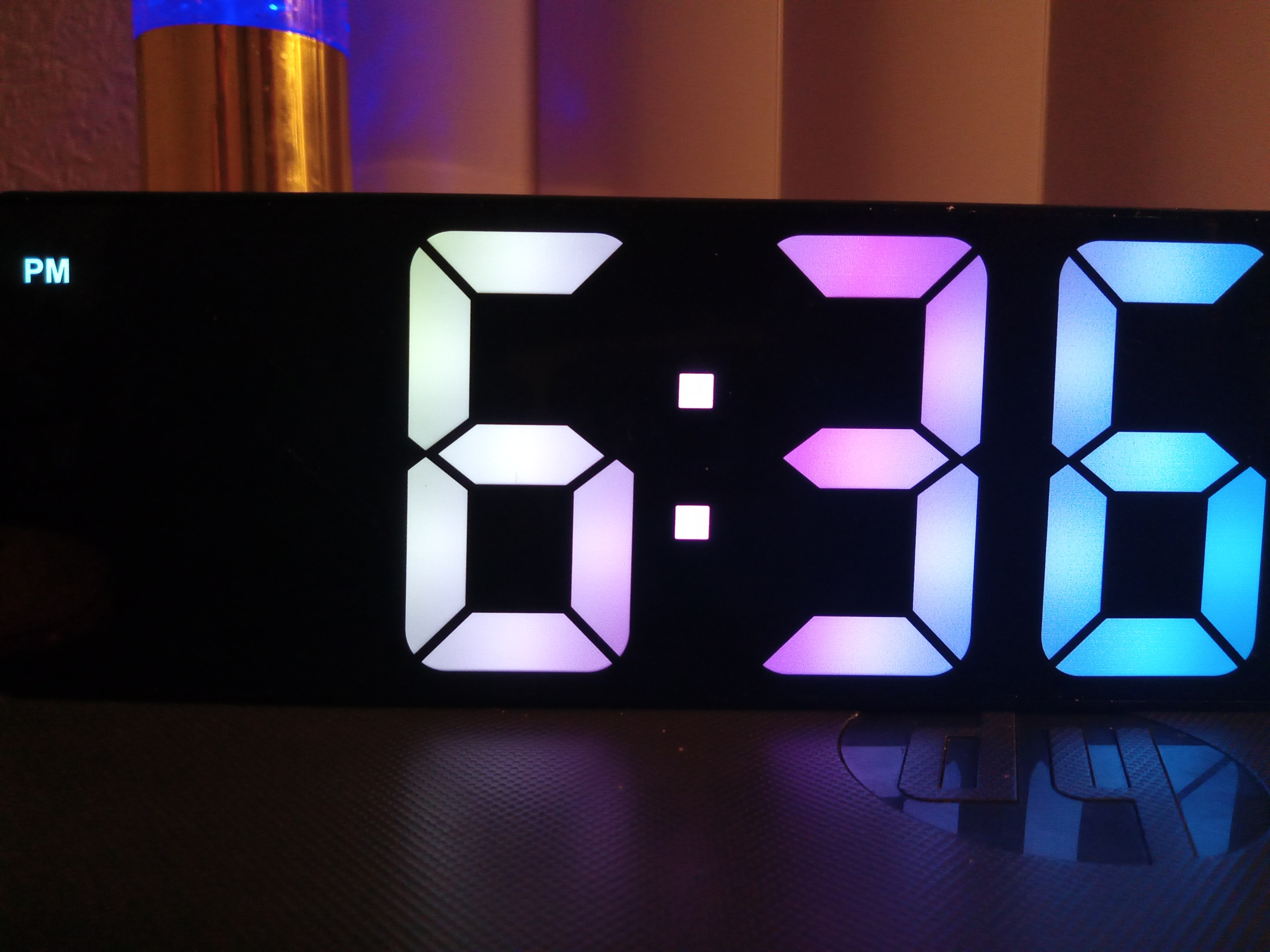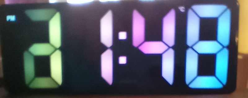 This is a digital LED alarm clock that features large, rainbow-colored LED segments and a handsome black plastic body.